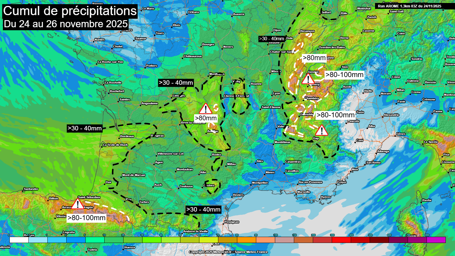 Ainsi, cet air très humide engendre de fortes précipitations sur une large partie sud de la France en ce début de semaine avec des cumuls prévus notables d'ici mercredi matin. Ain, Corrèze, Dordogne, Isère, Gironde, Haute-Savoie et Savoie sont d'ailleurs placés en vigilance orange Pluie-Inondation jusqu'à 00h ce soir.