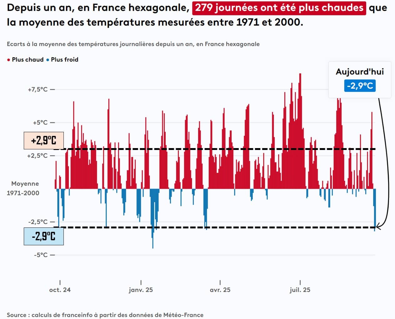 Par exemple, si les températures étaient situées 2,9°C sous les moyennes le 24 septembre, ce qui a déjà été le cas 6 fois dans l'année, des anomalies de 2,9°C au-dessus des normales sont bien plus récurrentes puisque cette valeur a été atteinte ou dépassée 63 fois depuis le 1er janvier.