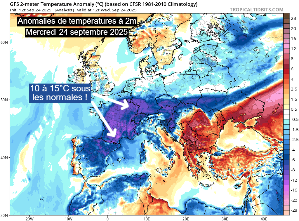 Anomalies de températures sur l'Europe pour la journée du 25 septembre 2025 – TropicalTidBits