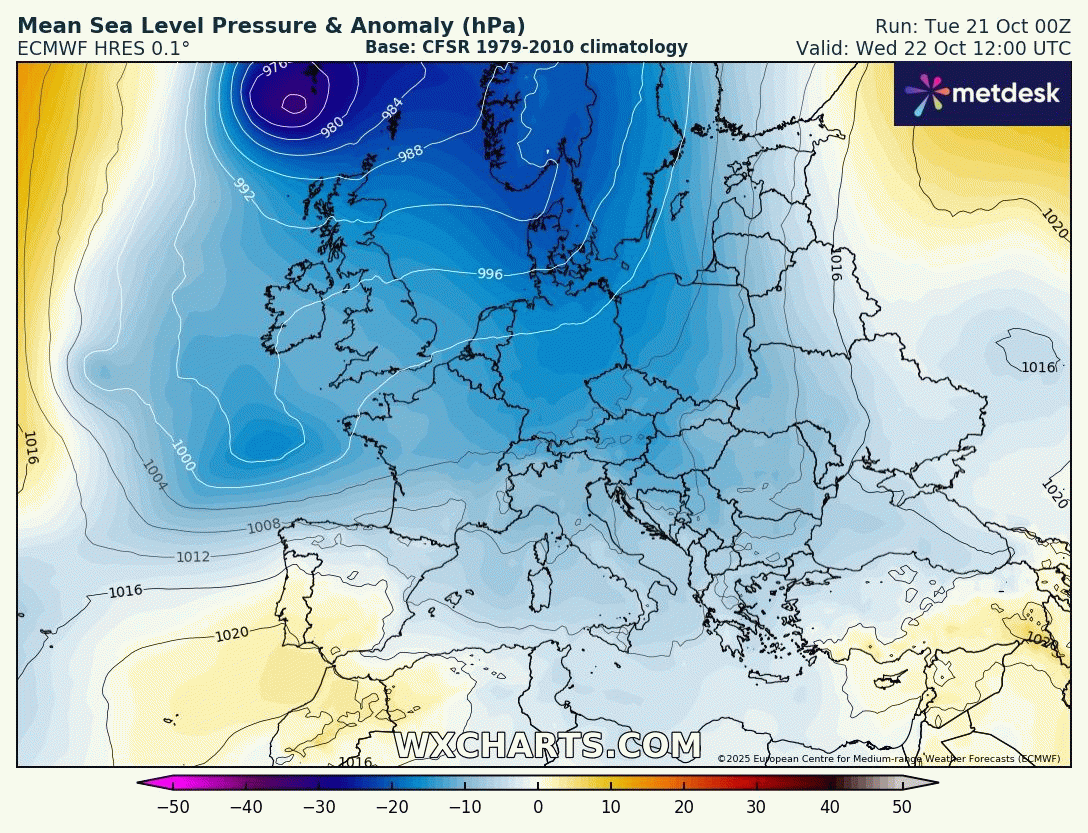 Dans un contexte fortement dépressionnaire, une dépression va se creuser au dessus de la Manche durant la nuit du mercredi 22 au jeudi 23 octobre 2025, poursuivant son creusement durant la journée de jeudi en se décalant vers la Belgique et les Pays-Bas. Au sud du cœur dépressionnaire, le gradient de pression va nettement se resserrer et les vents vont devenir violents, atteignant parfois le stade de la tempête durant la journée du jeudi 23 octobre 2025.