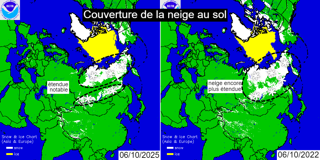 Étendue de la neige au sol (en blanc) sur l'Eurasie au 6 octobre en 2025 et en 2022 - NOAA