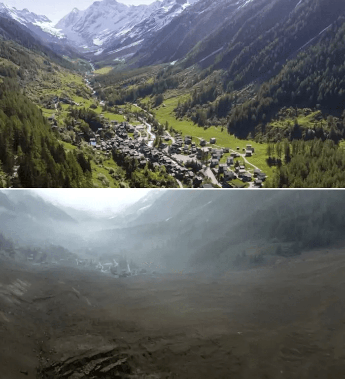 Comparaison avant/après l'éboulement du village de Blatten (Suisse) - photos SRF CH