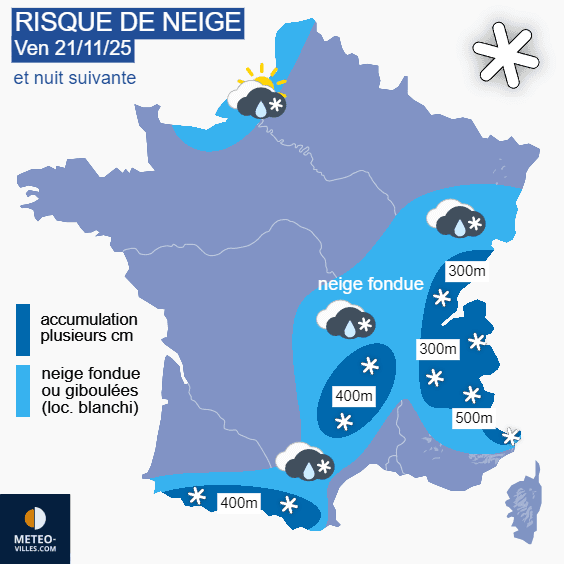Vendredi 21 novembre, les précipitations concerneront notamment les reliefs de l'est avec des chutes de neige jusque dans les plus basses vallées du Jura et des Alpes. Elles donneront un petit manteau blanc, surtout au dessus de 300 mètres. En dessous, la neige sera fondante avec une température faiblement positive. Notons que d'importantes quantités de neige vont tomber sur les Pyrénées avec une limite pluie/neige s'abaissant jusqu'au pied du relief, vers 400 mètres seulement. Du Pas-de-Calais au Calvados, des giboulées pourront encore se produire.
