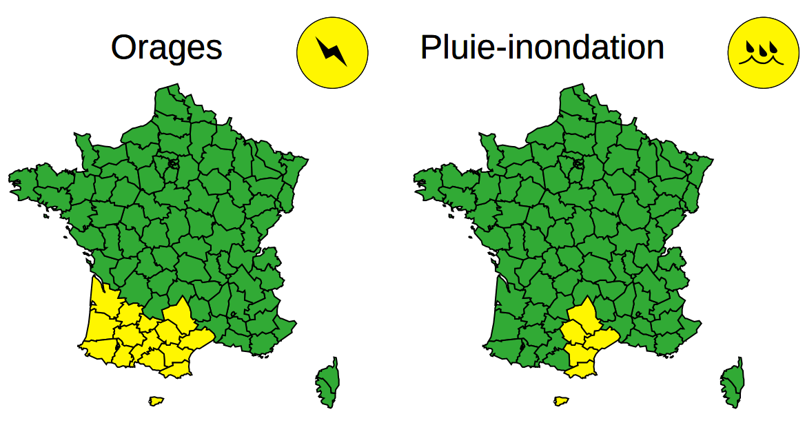 Météo France a d'ores et déjà placé plusieurs départements du sud de la France en vigilance jaune pluie-inondation. Il s'agit des Pyrénées-Orientales, de l'Aude, du Tarn, de l'Aveyron et de l'Hérault. Par ailleurs, l'organisme précise "qu'une aggravation du niveau de vigilance vers le niveau orange pour les paramètres "orages" et/ou "pluie/inondations" est possible".