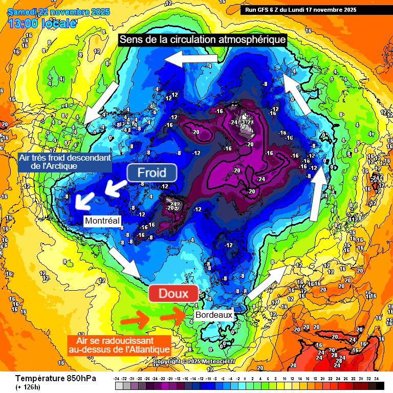 Néanmoins, aucune chute de neige n'est attendue à des latitudes similaires à celle de Montréal, comme à Bordeaux, où le temps se montrera certes plus frais mais où nous seront loin des conditions observées en novembre au Québec. Si les chutes de neige sont loin d'être rares au Canada en novembre, celles-ci sont quasiment impossibles du côté de Bordeaux en cette période de l'année, d'autant plus dans la tendance actuelle de l'augmentation moyenne des températures.