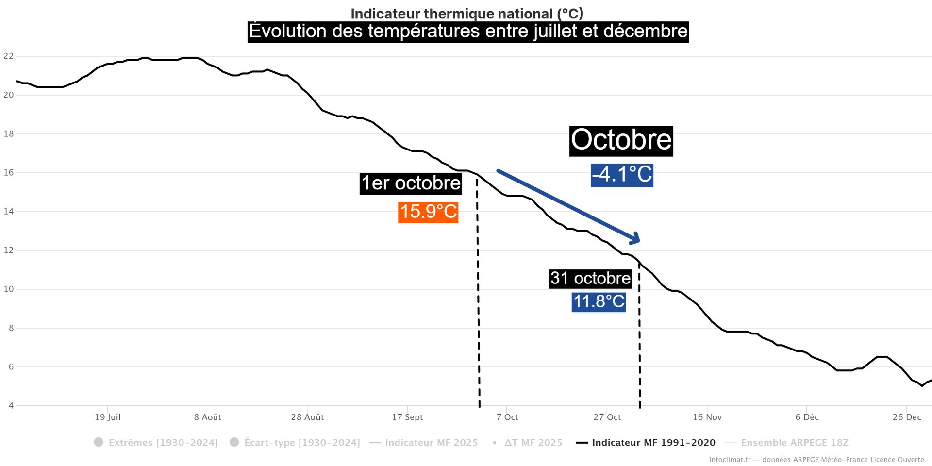 Après avoir atteint un pic entre la seconde quinzaine de juillet et le début du mois d'août, le thermomètre commence peu à peu à décliner en France. La baisse de la température moyenne nationale s'accélère ensuite au cours du mois de septembre mais c'est durant le mois d'octobre qu'elle est la plus importante. Encore située à 15.9°C le 1er octobre, les températures moyennes chutent jusqu'à atteindre 11.8°C le 31, soit une chute de 4.1°C, soit la seconde baisse de températures la plus importante de l'année après novembre (-4.6°C entre le 1er et le 30).