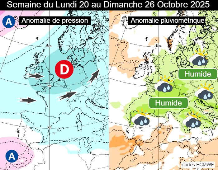 Anomalie de pression et anomalie pluviométrique en semaine du 20 au 26 octobre 2025 - ECMWF
