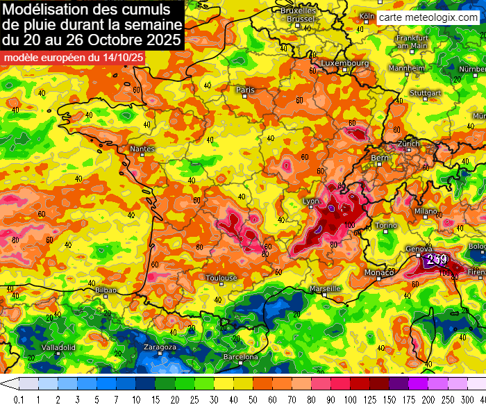 Modélisation des cumuls de pluie en semaine du lundi 20 au dimanche 26 octobre 2025 - meteologix.com