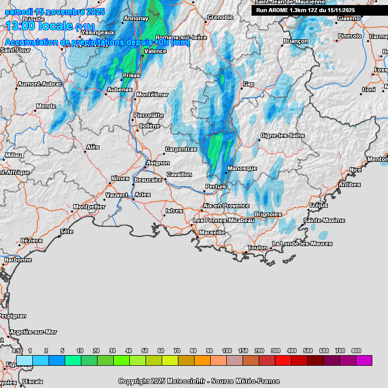 Les cumuls de précipitations prévus devraient être comparables à ceux enregistrés ces dernières heures sur les Cévennes ardéchoises, mais probablement supérieurs à ceux de samedi dans la Drôme et significativement plus importants dans l’arrière-pays azuréen, sur les hauteurs entre Fréjus, Nice et Menton. Sur cette zone géographique, il est envisageable de dépasser largement les 100 mm en 24 heures.